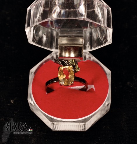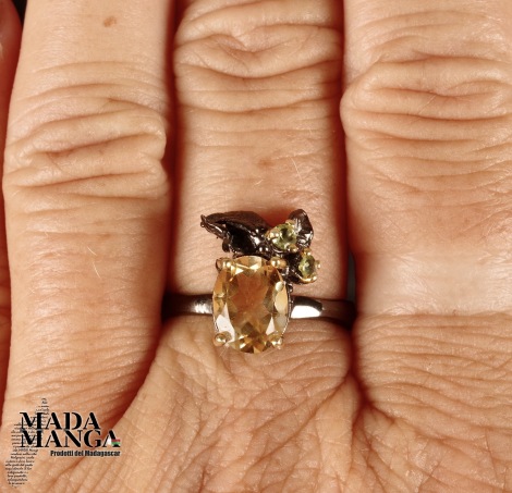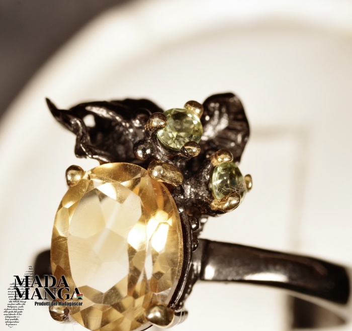Anello in Argento 925 rodiato con rodio nero e con placcature in oro giallo, con Quarzo citrino da mm.7x9 e due piccoli peridoti. Misura americanana 8 , misura italiana 17, diametro interno mm.18,19, peso anello 2,9 grammi. Venduto con scatolina regalo. L'anello è realizzato artigianalmente in pezzo unico per modello e misura.