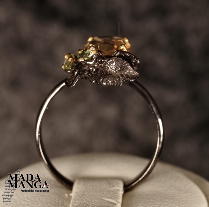 Anello in Argento 925 rodiato con rodio nero e con placcature in oro giallo, con Quarzo citrino da mm.7x9 e due piccoli peridoti.