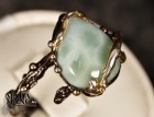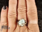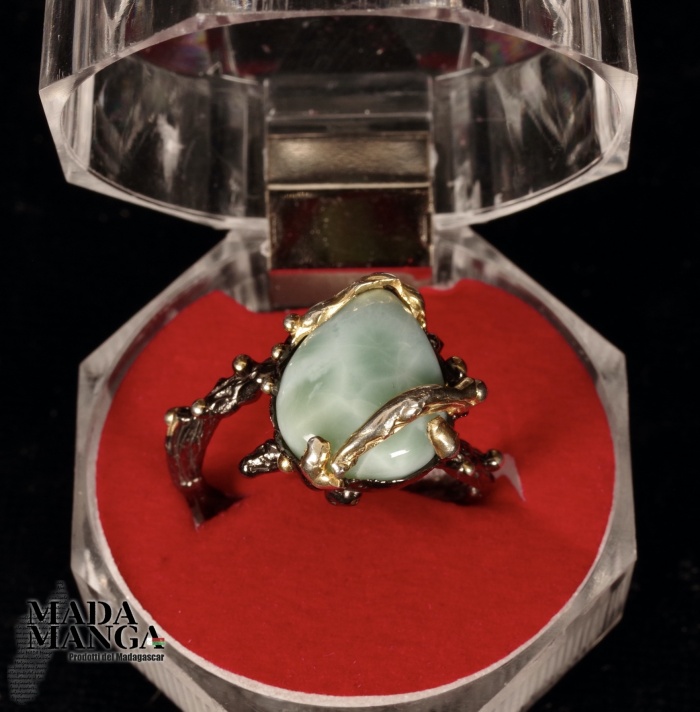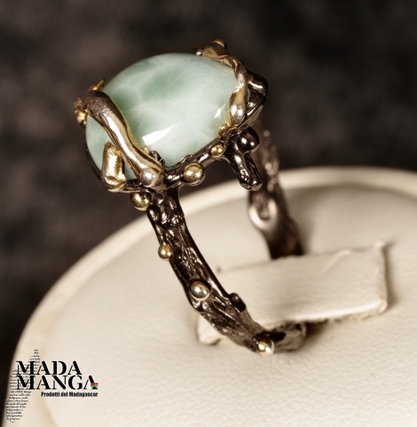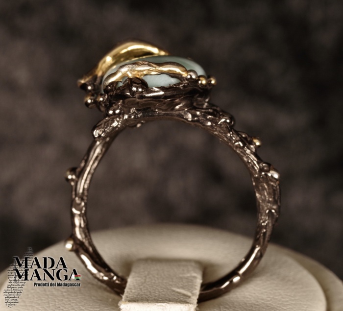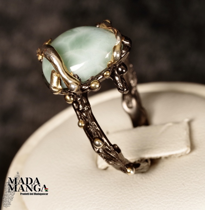 Anello in Argento 925 rodiato con rodio nero e con placcature in oro giallo, con Larimar da mm.11x13, peso anello 5,7 grammi. Misura americana 7,75, misura italiana 16,5, diametro interno mm.17,95. Venduto con scatolina regalo. L'anello è realizzato artigianalmente in pezzo unico per modello e misura.