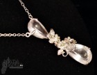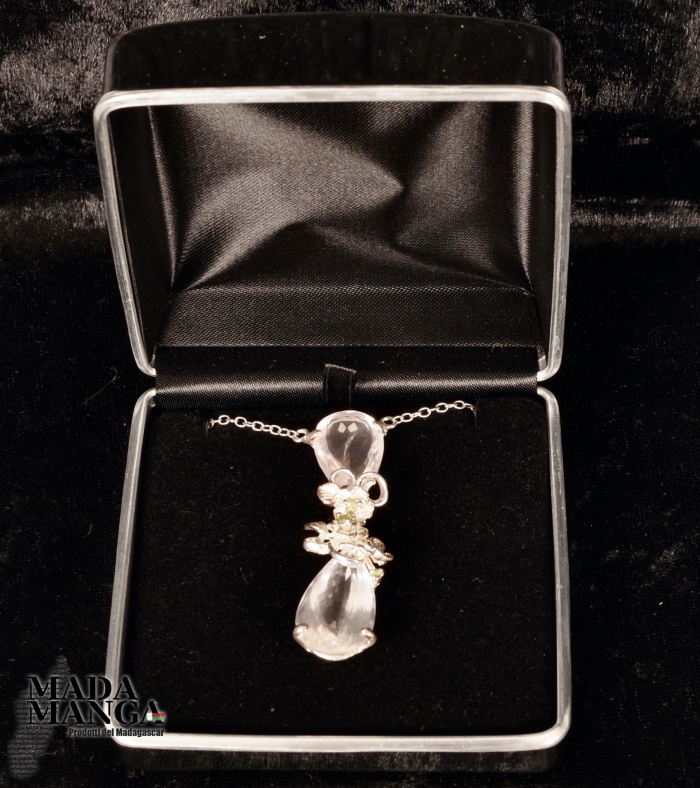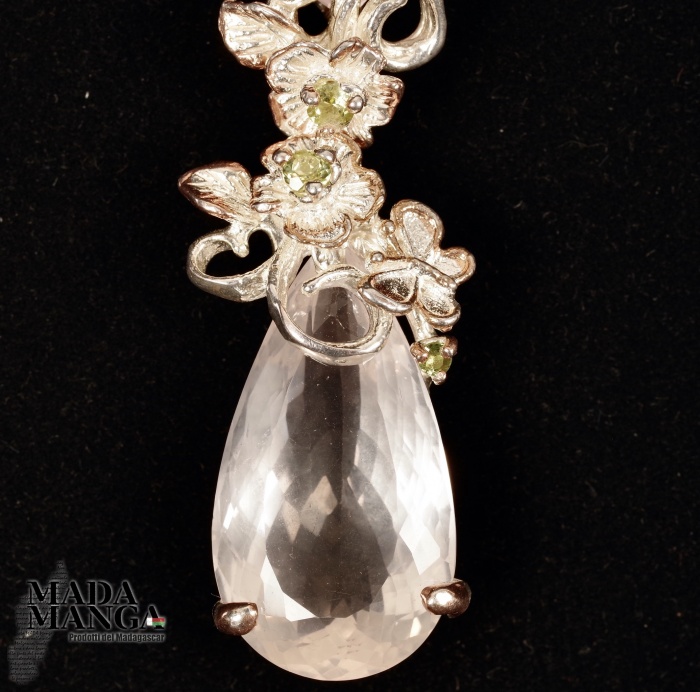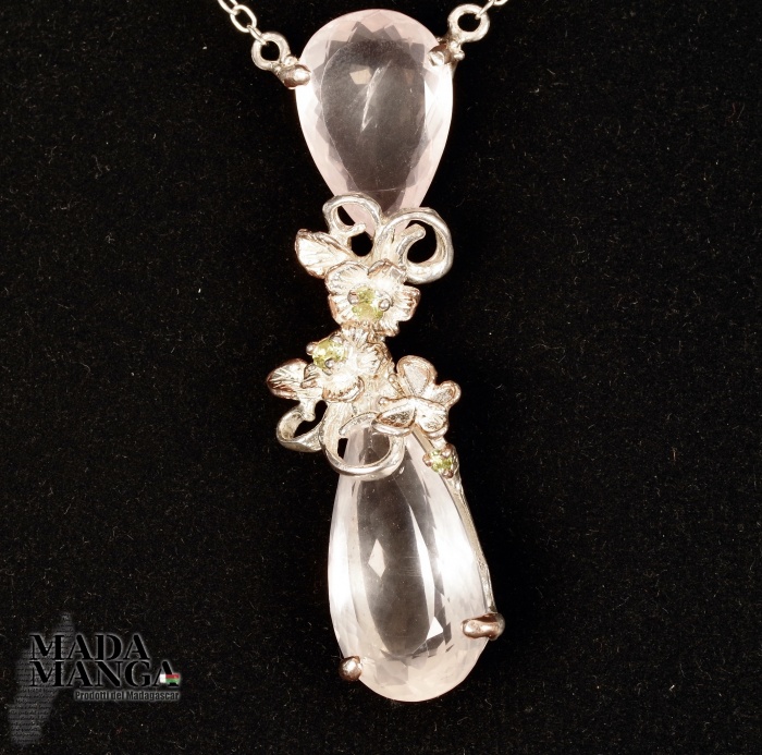 Collana in Argento 925 con placcature in oro rosa, con Quarzi rosa di bella trasparenza e piccoli peridoti. Dimensione pendente cm.1,6x6,2. Lunghezza collana cm.50. Peso 18 grammi. Venduta con scatola regalo.
