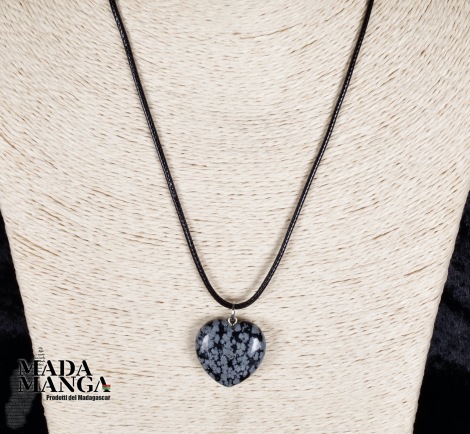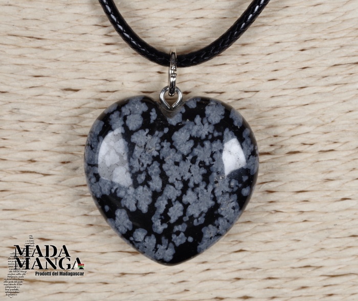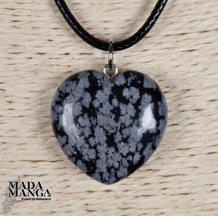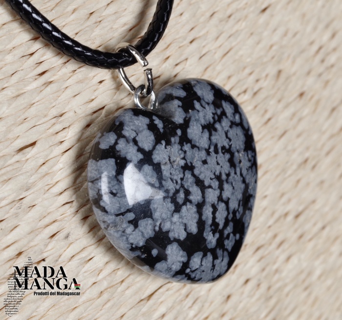 Ciondolo a forma di cuore in ossidiana fiocco di neve, dimensioni cm.2,5x2,6H. Venduto con laccetto in corda cerata.