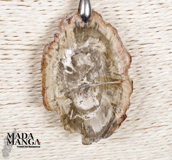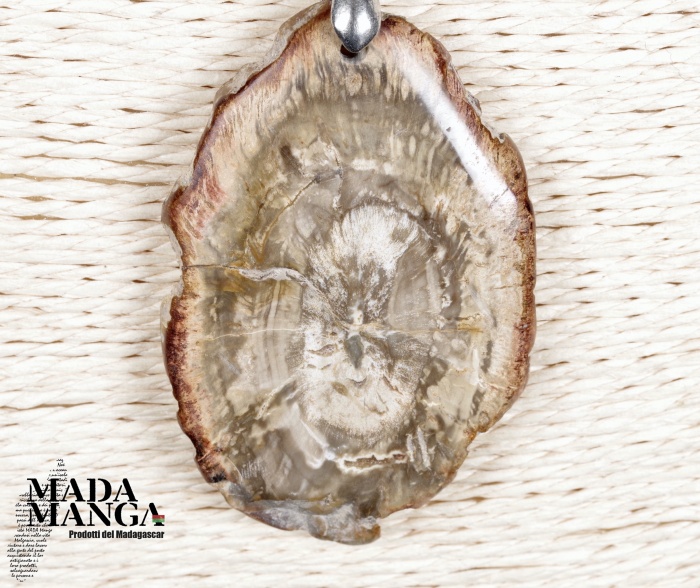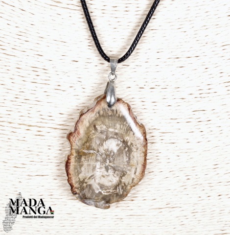 Ciondolo realizzato con fetta di legno fossile colori sul grigio e marrone, dimensioni cm.3,4x5,1H, peso 19,4 grammi, venduto con laccetto in corda cerata. La confezione regalo consiste in sacchetto in tulle e scatolina in carta antemoro.