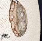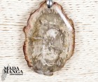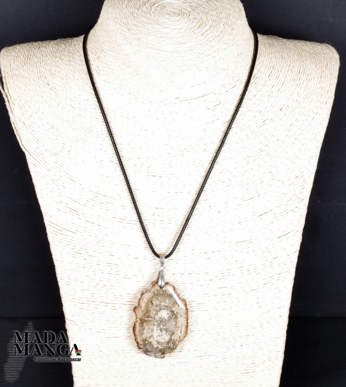 Ciondolo realizzato con fetta di legno fossile colori sul grigio e marrone, dimensioni cm.3,4x5,1H, venduto con laccetto in corda cerata.