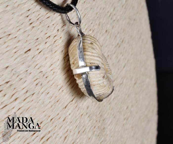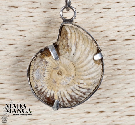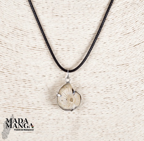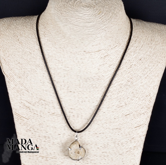 Ciondolo con Ammonite fossile Perisphinctes montato in argento, dimensioni cm.2,2x2,4, venduto con laccetto in corda cerata.