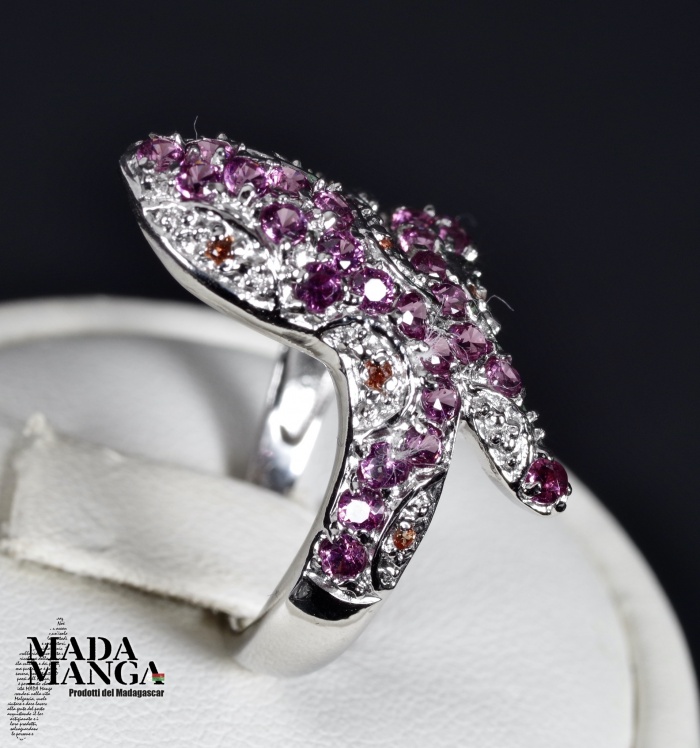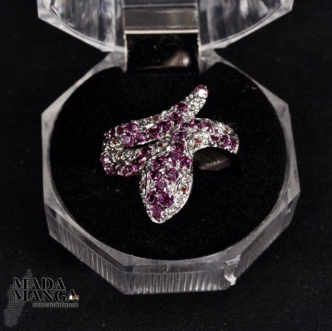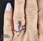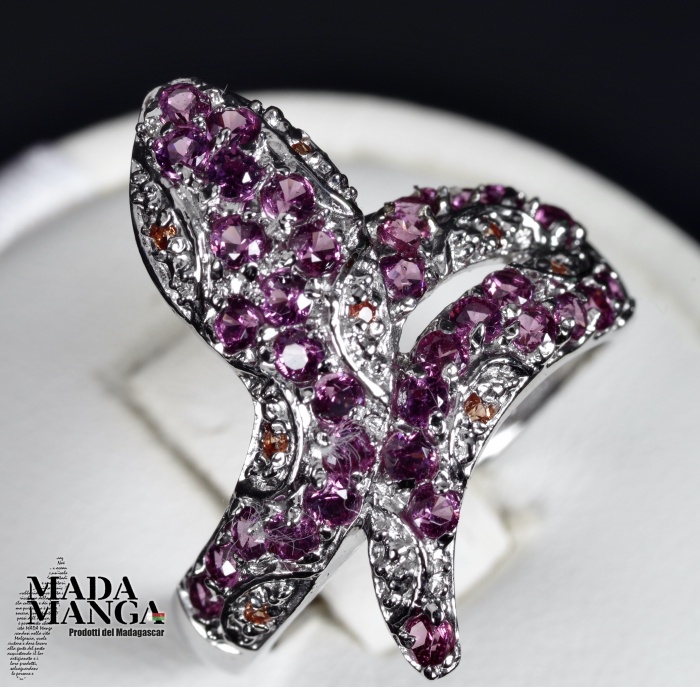Anello in Argento 925 a forma di serpente con placcature in oro bianco tempestato di rodoliti.