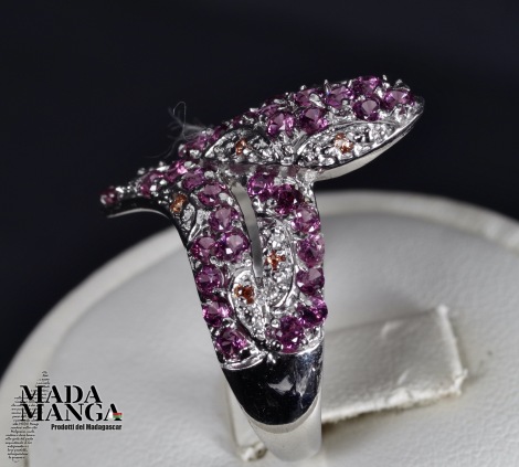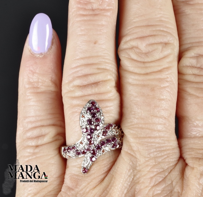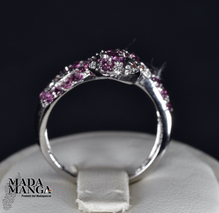 Anello in Argento 925 a forma di serpente con placcature in oro bianco tempestato di rodoliti, peso 3,2 grammi. Misura americana 7, misura italiana 14,5, diametro interno mm.17,35. Venduto con scatolina regalo. L'anello è realizzato artigianalmente in pezzo unico per modello e misura.
