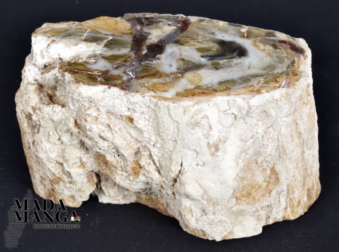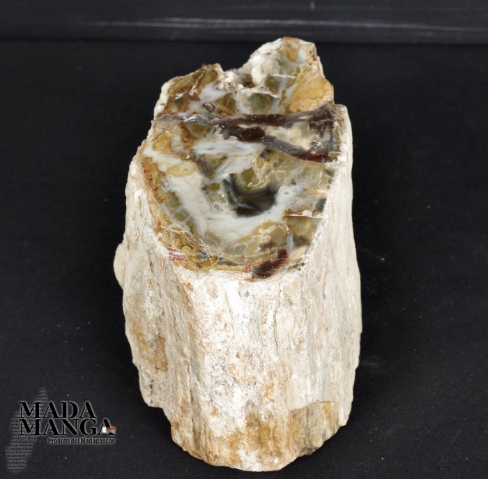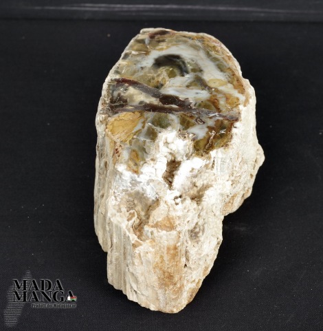 Tronchetto di Legno Fossile del Madagascar con varie tonalità di colore e con inclusioni di agata, lucidato su una parte e con corteccia esterna, dimensioni cm.10x5,5x6H, peso 762 gr.