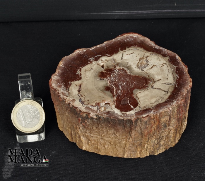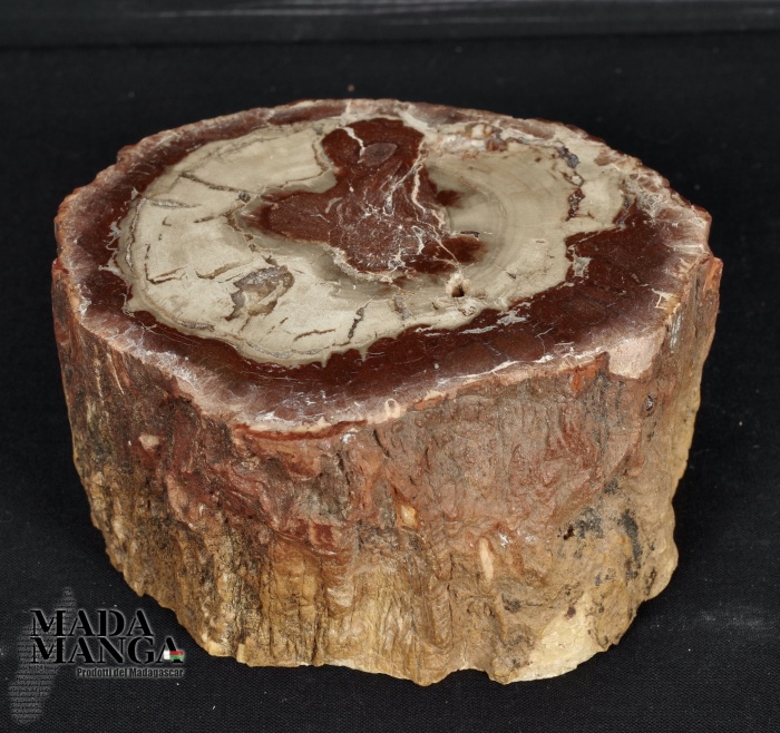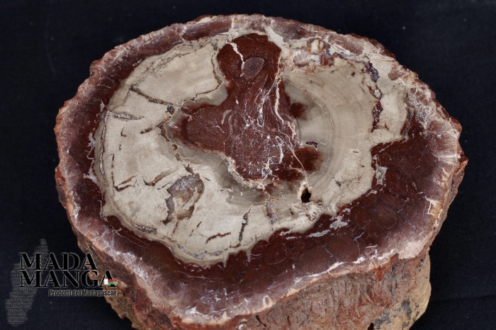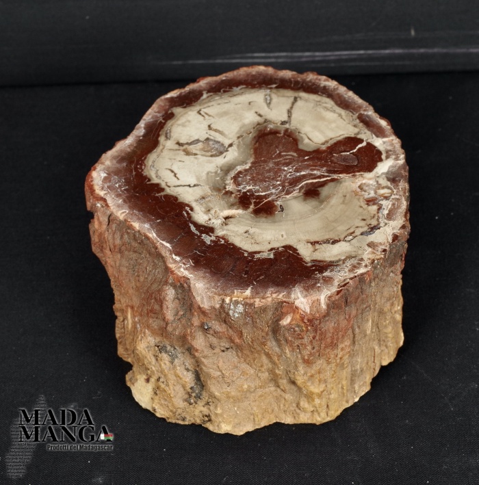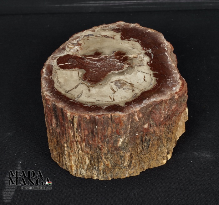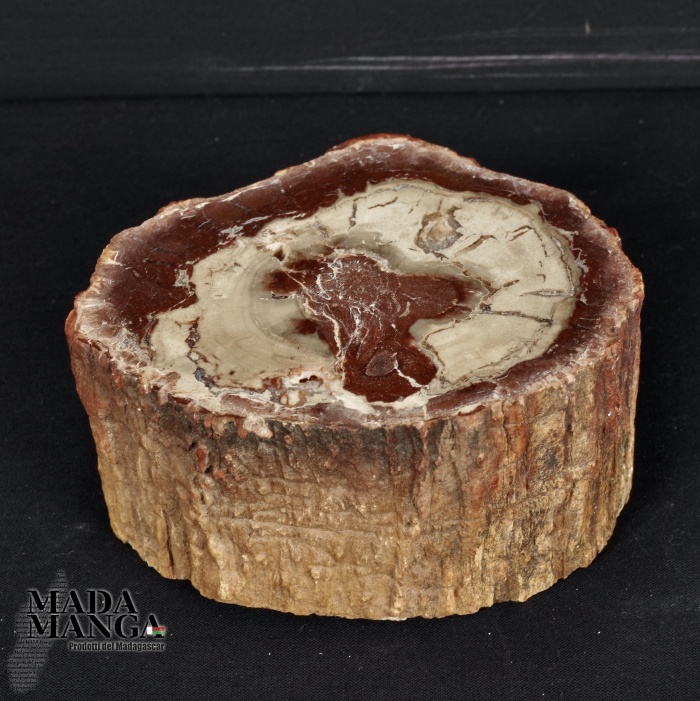Tronchetto di Legno Fossile del Madagascar dal colore bianco al rosso/bruno, lucidato su una parte e con corteccia esterna, dimensioni cm.9,2x8x4,5H, peso 604 gr.