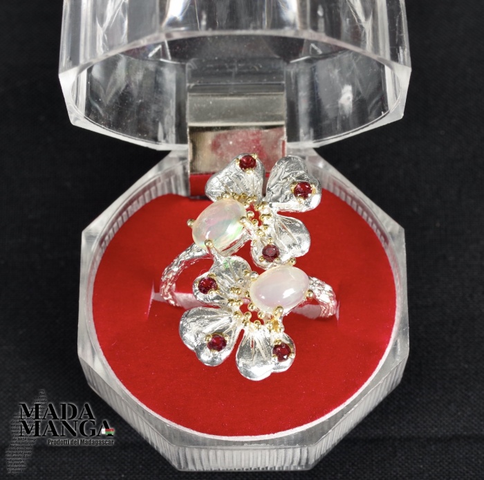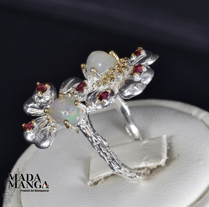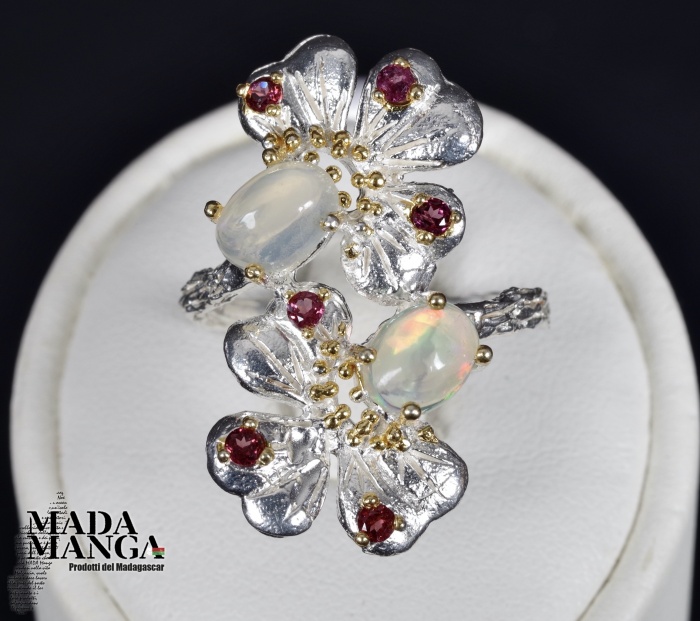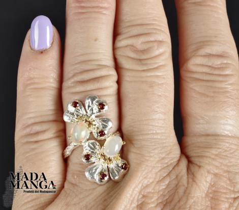 Anello in Argento 925 con placcature in oro giallo, con due Opali da mm.5x7 e piccole rodoliti. Misura americana 6,5, misura italiana 14, diametro interno mm.17,10, peso anello 4,2 grammi. Venduto con scatolina regalo. L'anello è realizzato artigianalmente in pezzo unico per modello e misura.
