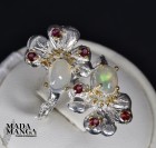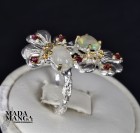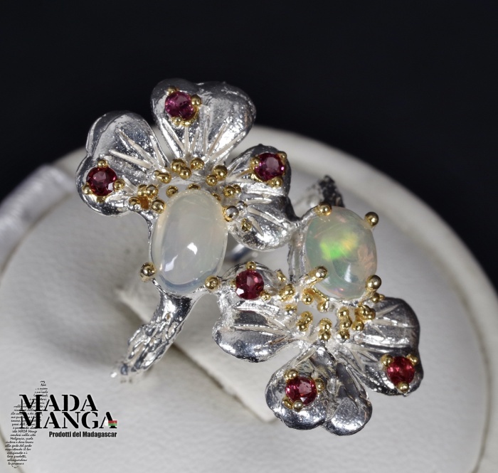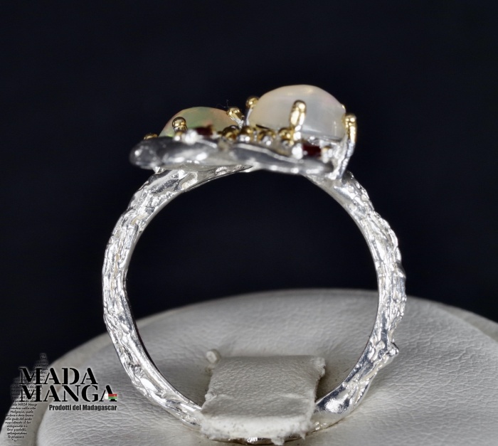 Anello in Argento 925 con placcature in oro giallo, con due Opali da mm.5x7 e piccole rodoliti.