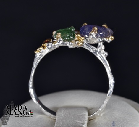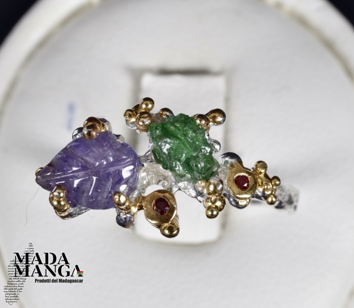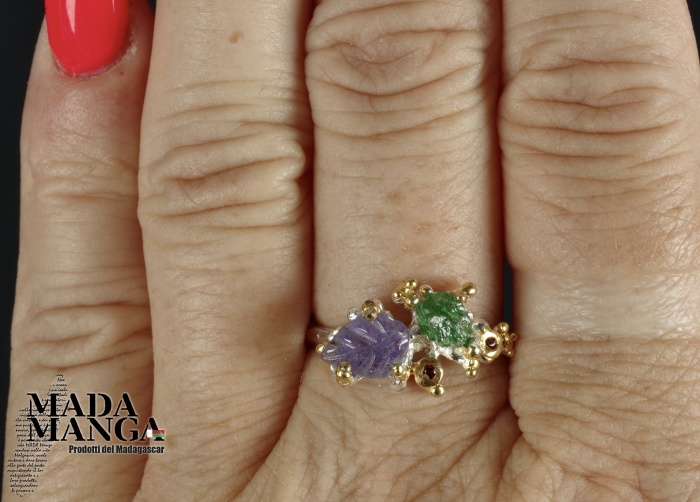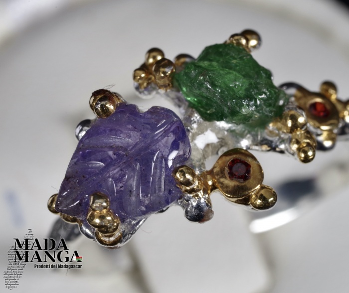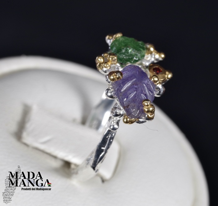 Anello in Argento 925 con placcature in oro giallo, con tanzanite lavorata a forma di foglia da mm.5x7, cromo diopside e piccoli granati.