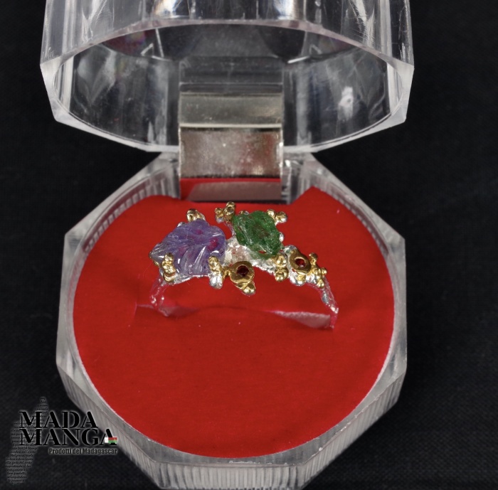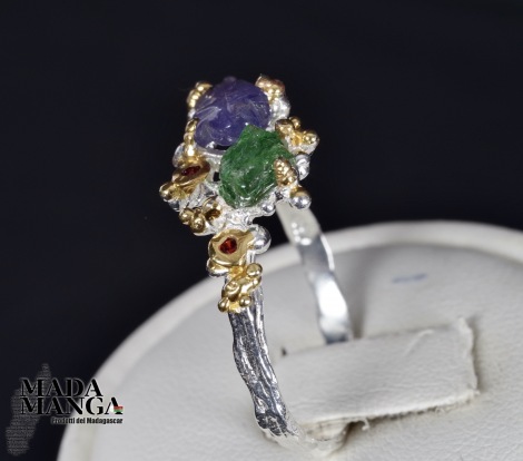 Anello in Argento 925 con placcature in oro giallo, con tanzanite lavorata a forma di foglia da mm.5x7, cromo diopside e piccoli granati. Misura americanana 8 , misura italiana 17, diametro interno mm.18,19. peso anello 2,8 grammi. Venduto con scatolina regalo. L'anello è realizzato artigianalmente in pezzo unico per modello e misura.