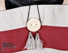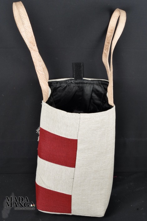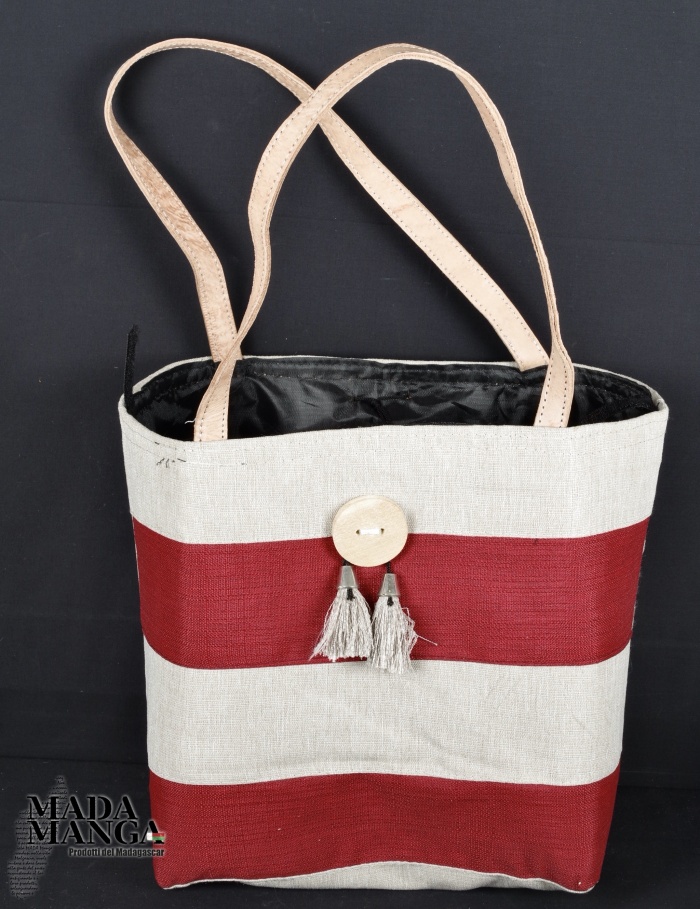 Borsa in tessuto a righe colori grigio chiaro/rosso bordeaux, manici in pelle, realizzata a mano, chiusura ad elastico.