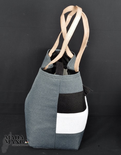 Borsa in tessuto a righe colori grigio chiaro/nero/grigio tortora, manici in pelle, realizzata a mano, chiusura ad elastico.