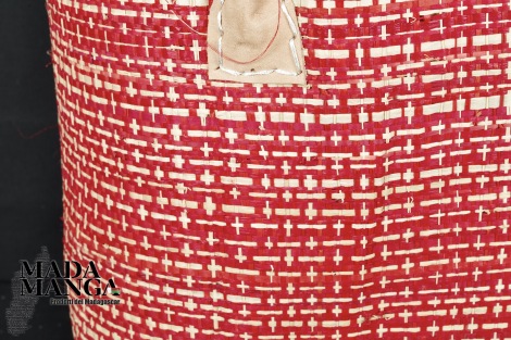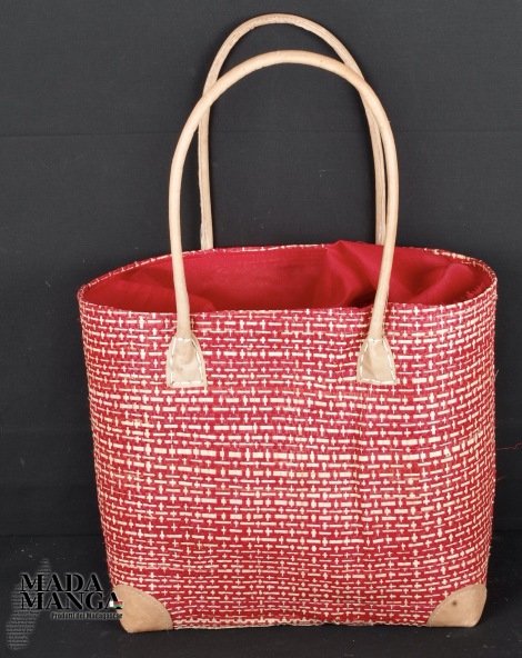 Borsa in Rafia a doppio strato, colore rosso/beige, bordi di appoggio e manici in pelle, realizzata a mano, chiusura a coulisse superiore in cotone. Disponibile in tre misure