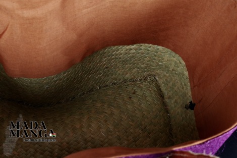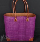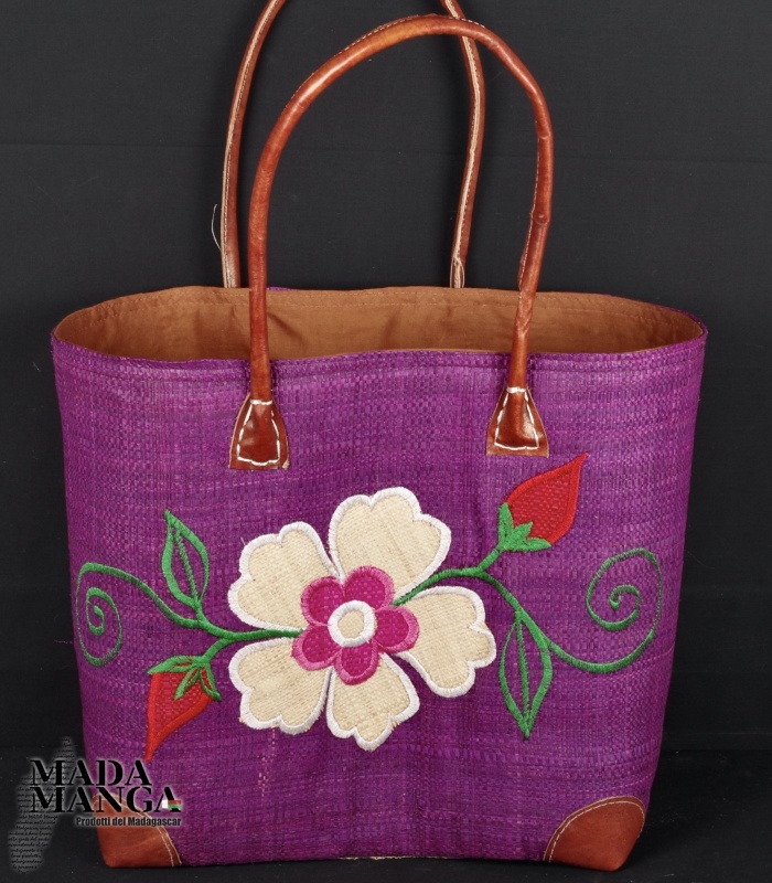 Borsa in Rafia a doppio strato, colore viola con decoro a fiori, bordi di appoggio e manici in pelle, realizzata a mano, chiusura a coulisse superiore in cotone. Disponibile in tre misure