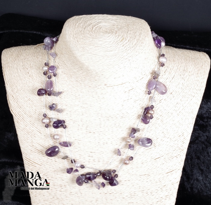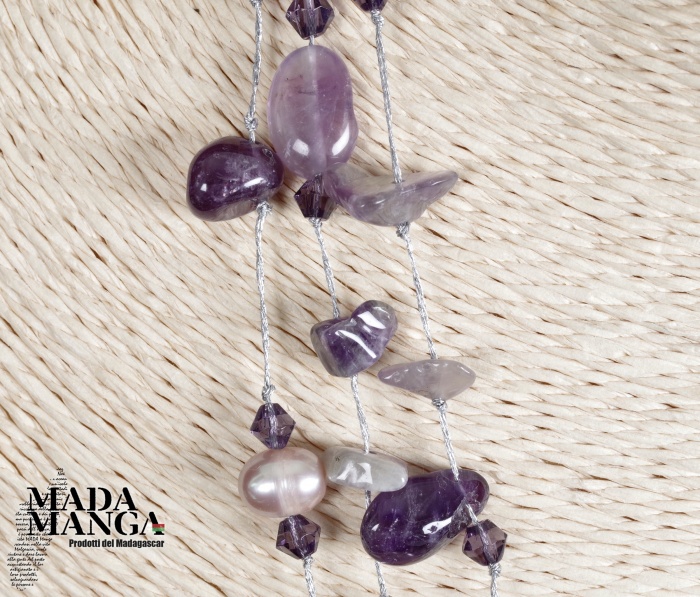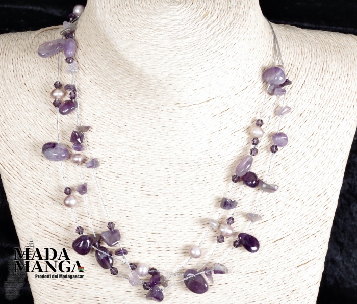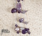 Collana con ametiste e perle d'acqua dolce, fili e gancio in acciaio, lunghezza cm.44, peso 27,5 grammi. La confezione regalo consiste in sacchetto in tulle con scatolina in carta antemoro.