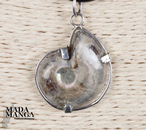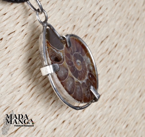 Ciondolo con Ammonite fossile naturale lucidata, perfetta definizione dei setti di crescita, montato in argento, dimensioni cm.2,4x2,8H, venduto con laccetto in corda cerata.
