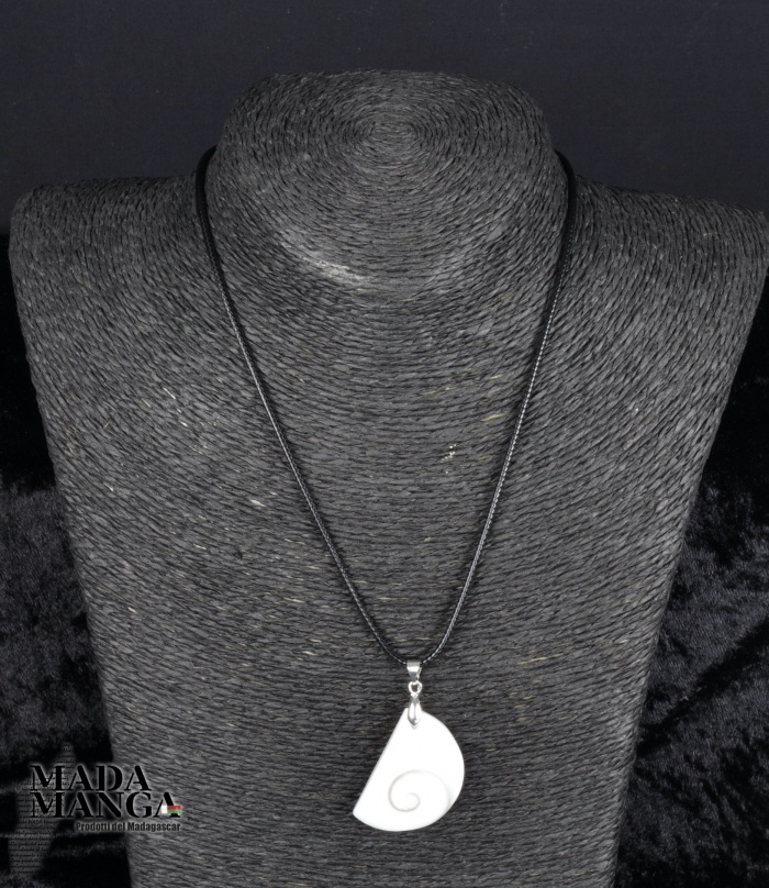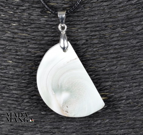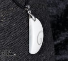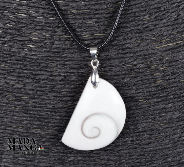 Ciondolo in Occhio di S. Lucia o Occhio di Shiva a forma di mezzaluna, dimensioni cm.2,4x3,6, peso 10,6 grammi, venduto con laccetto in corda cerata. La confezione regalo è composta da sacchetto in tulle e scatolina in carta antemoro.