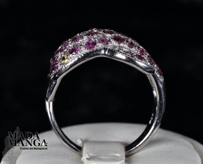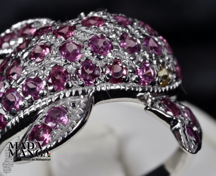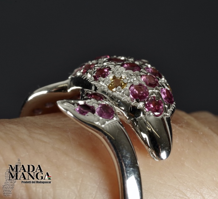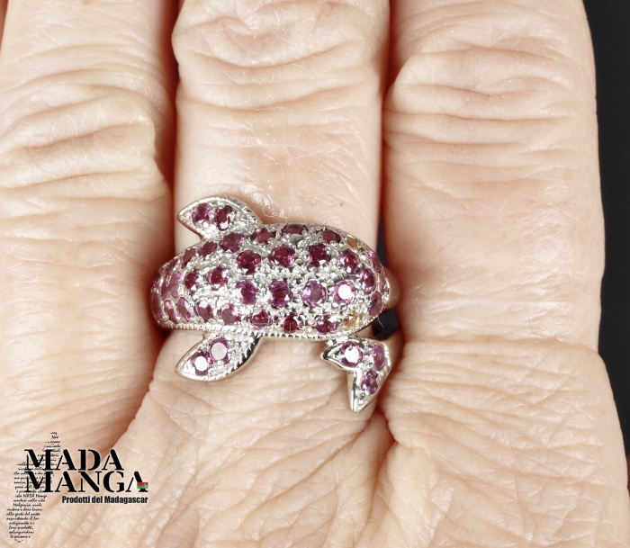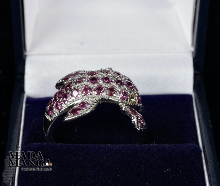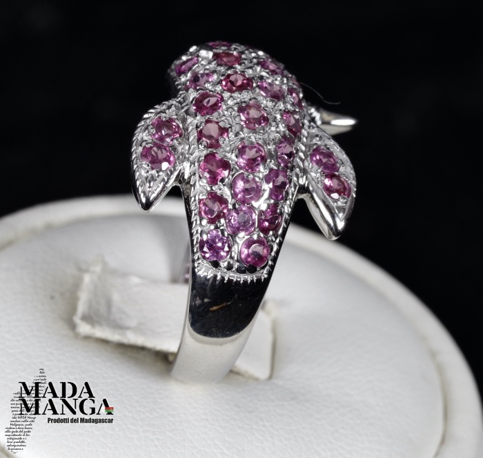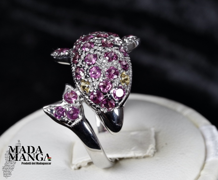 Anello in Argento 925, con placcature in oro bianco, a forma di delfino con rodoliti da mm.2 e due zaffiri gialli.