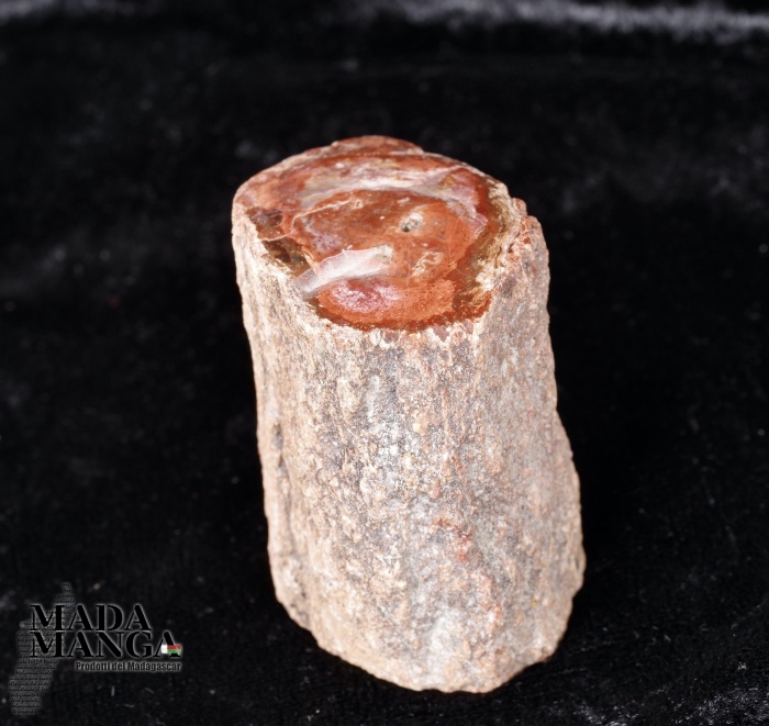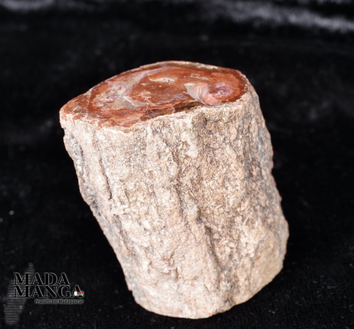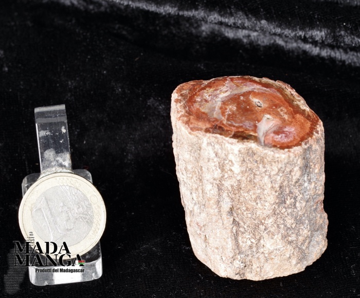 Tronchetto di Legno Fossile del Madagascar dal colore rosso/bruno, lucidato su due parti e con corteccia esterna, dimensioni cm.3,2x4,2x4,7H, peso 107 gr.