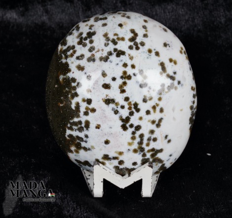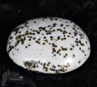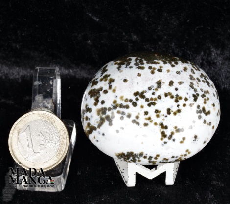 Diaspro oceanico in forma libera, di colore bianco e verde scuro, con orbicoli a "fiore", dimensioni cm.5,1x4,4x2,6, peso 81 grammi.