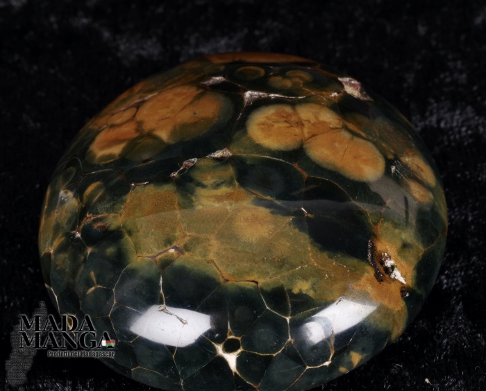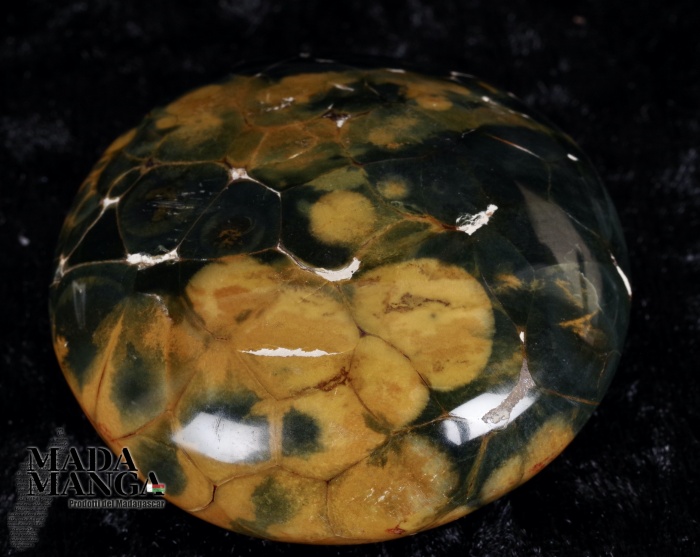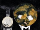 Diaspro oceanico in forma libera, di colore verde scuro e giallo ocra, dimensioni cm.5,2x5,2x2,8, peso 99,6 grammi.