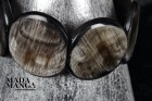 Braccialetto elastico in corno diametro degli elementi cm.2,8, realizzato artigianalmente. La confezione regalo consiste in sacchetto in tulle e bustina in carta antemoro con decoro floreale.