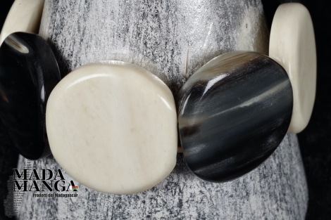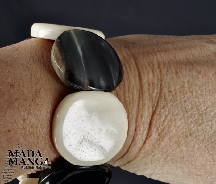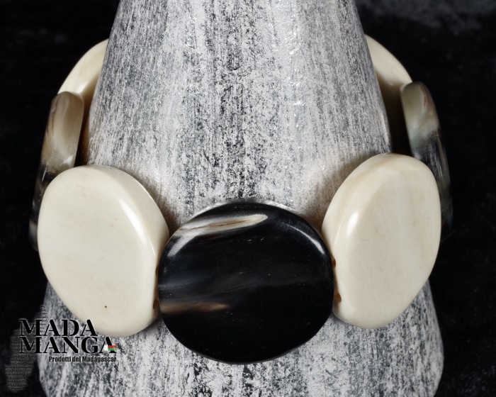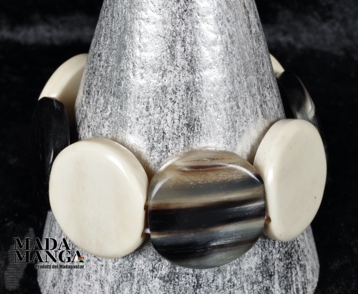 Braccialetto elastico in corno di zebù e osso diametro degli elementi cm.2,8, realizzato artigianalmente. La confezione regalo consiste in sacchetto in tulle e bustina in carta antemoro con decoro floreale.