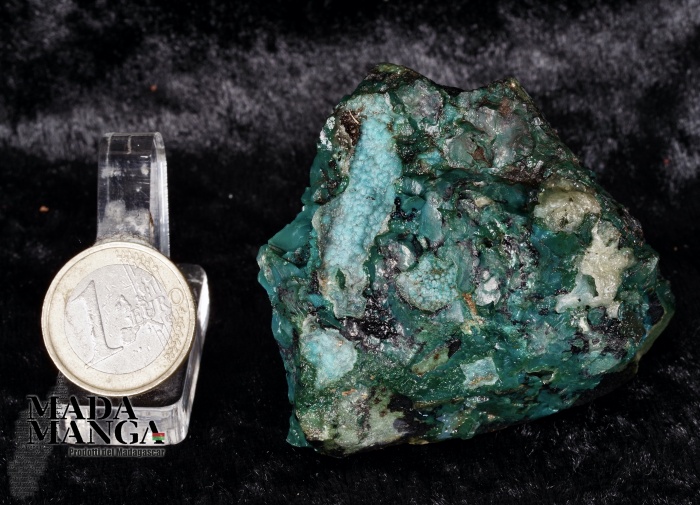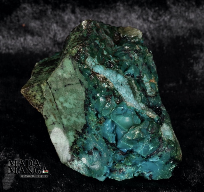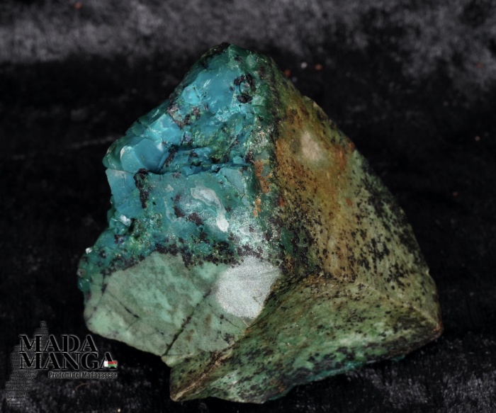 Crisocolla grezza, fotografata bagnata per risaltare i colori in quanto non è lucidata, dimensione cm.5,4x4x6,7 peso 152 grammi.