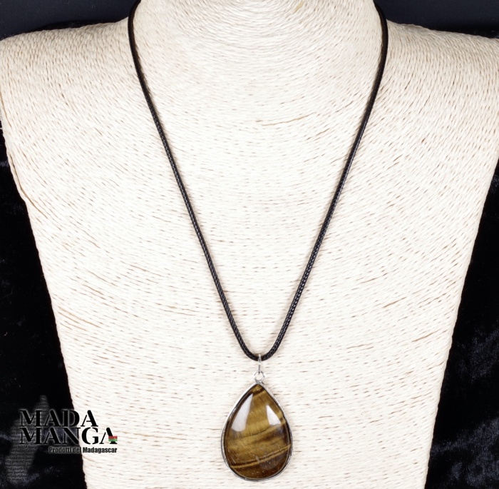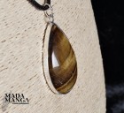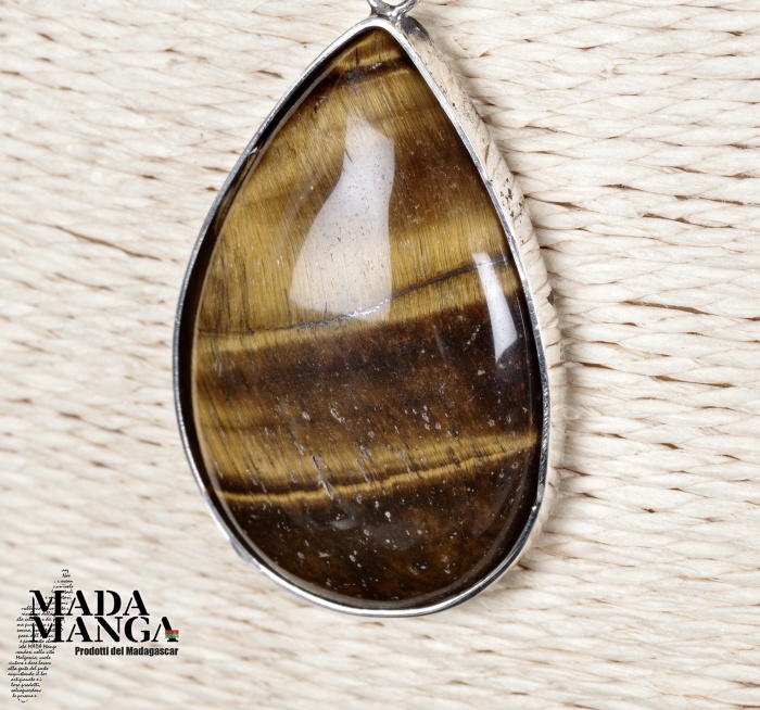 Ciondolo a goccia in Occhio di Tigre montato in argento, dimensioni cm.2,8x4,1H, peso 14,3 grammi. Venduto con laccetto in corda cerata. La confezione regalo consiste in sacchetto in tulle e scatolina in carta antemoro.