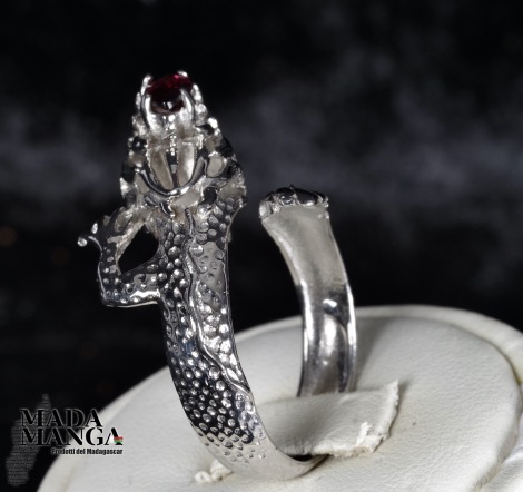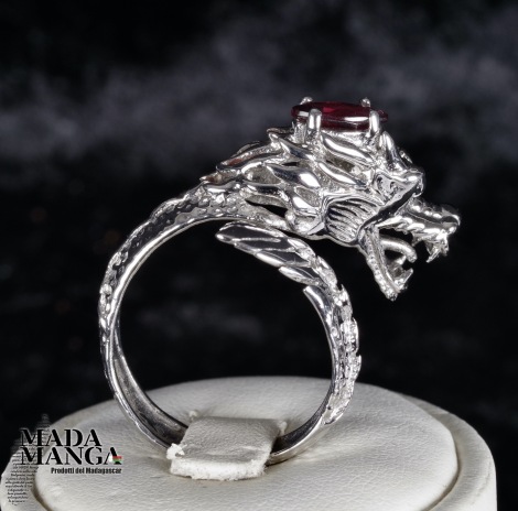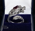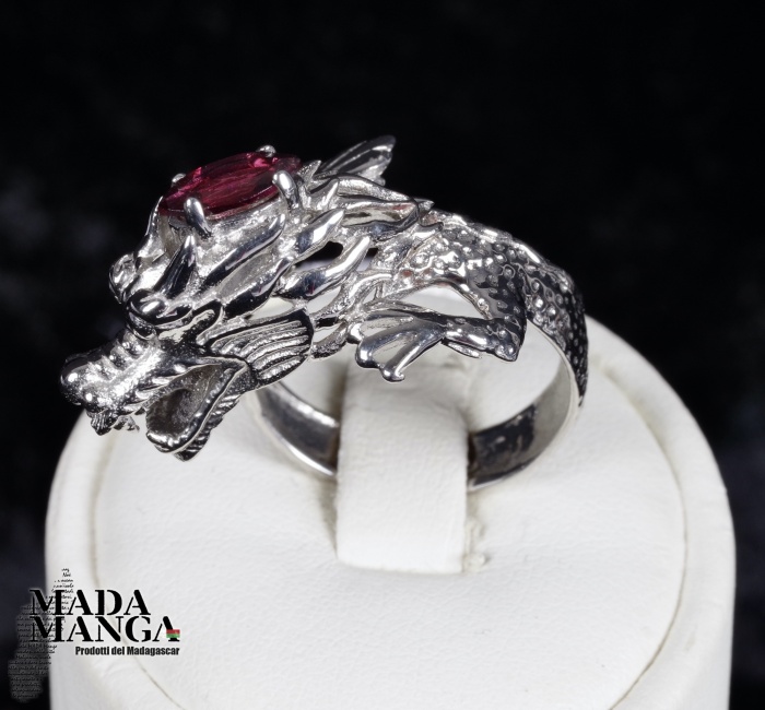 Anello in Argento 925 a forma di dragone con placcature in oro bianco, con rodolite da mm.8x4. Misura americanana 8 , misura italiana 17, diametro interno mm.18,19. peso anello 7 grammi. Venduto con scatolina regalo. L'anello è realizzato artigianalmente in pezzo unico per modello e misura.