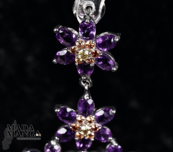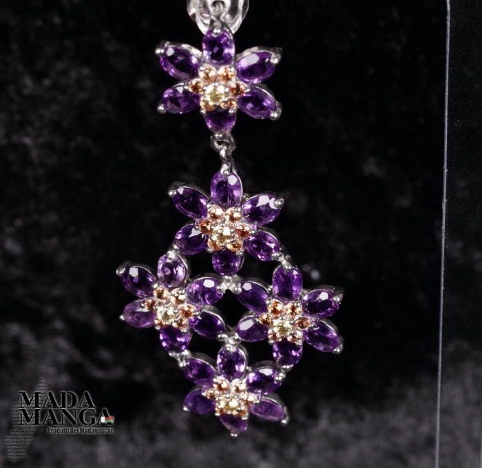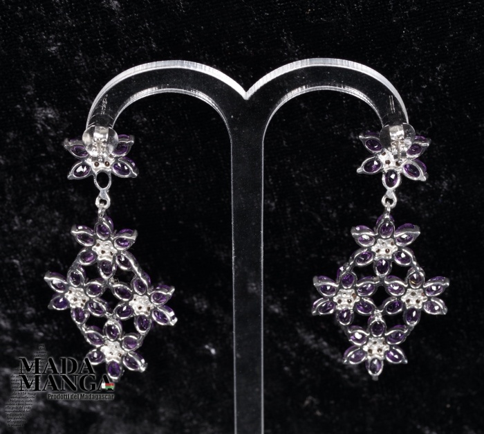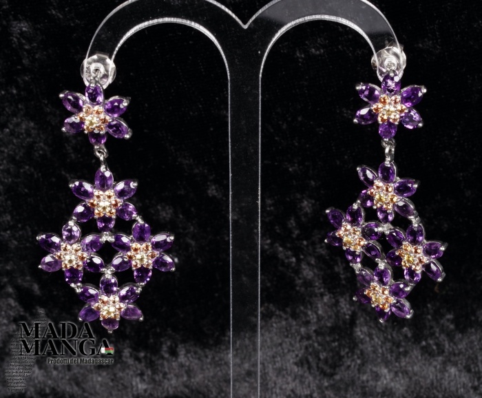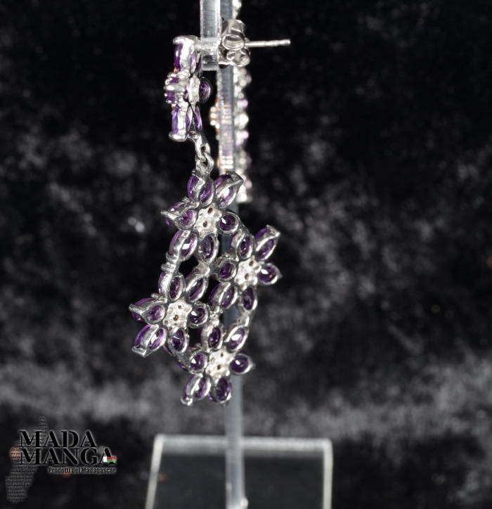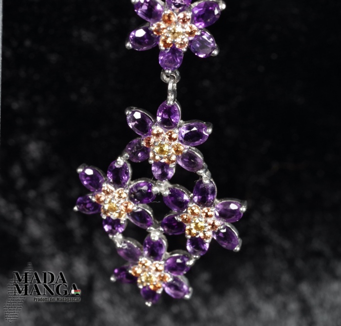 Luminiosissimi Orecchini in Argento 925 con placcature in oro bianco, con ametiste disposte a fiore da mm.4x3 e piccoli zaffiri, dimensioni cm.2,5x5,1H, peso 8,7 grammi. Venduti con scatolina regalo. Gli orecchini sono realizzati in pezzo unico per modello.