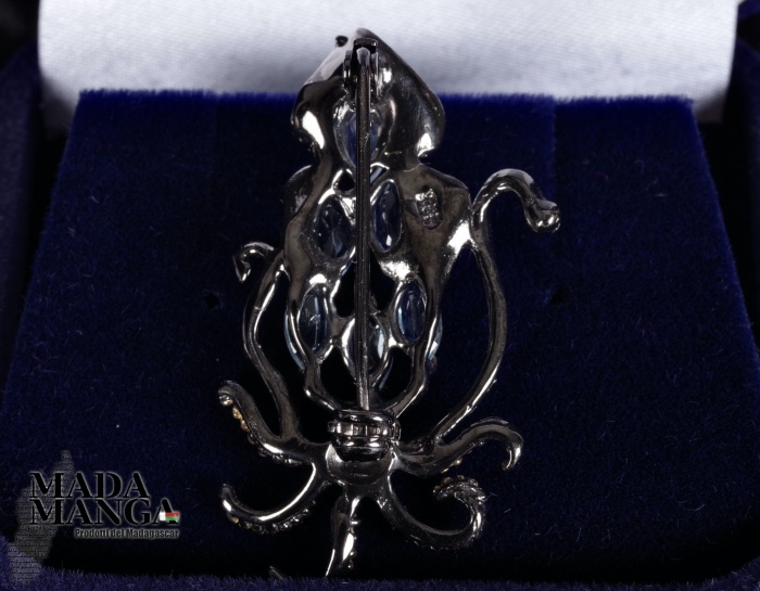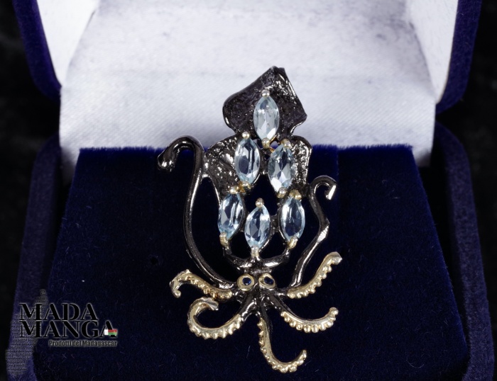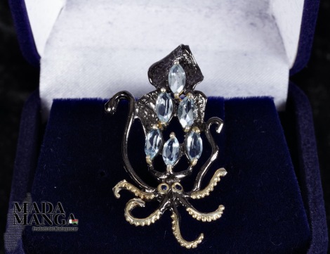 Spilla a forma di seppia in argento 925 rodiato con rodio nero e con placcature in oro giallo, con n°6 topazi taglio marquise da mm.6x4, dimensioni cm.2,2x3,8, peso 5,1 grammi. Venduta con scatolina regalo.