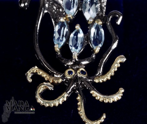Spilla a forma di seppia in argento 925 rodiato con rodio nero e con placcature in oro giallo, con n°6 topazi taglio marquise da mm.6x4.
