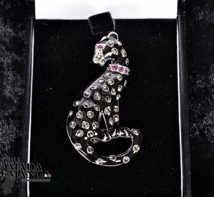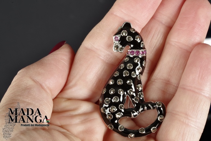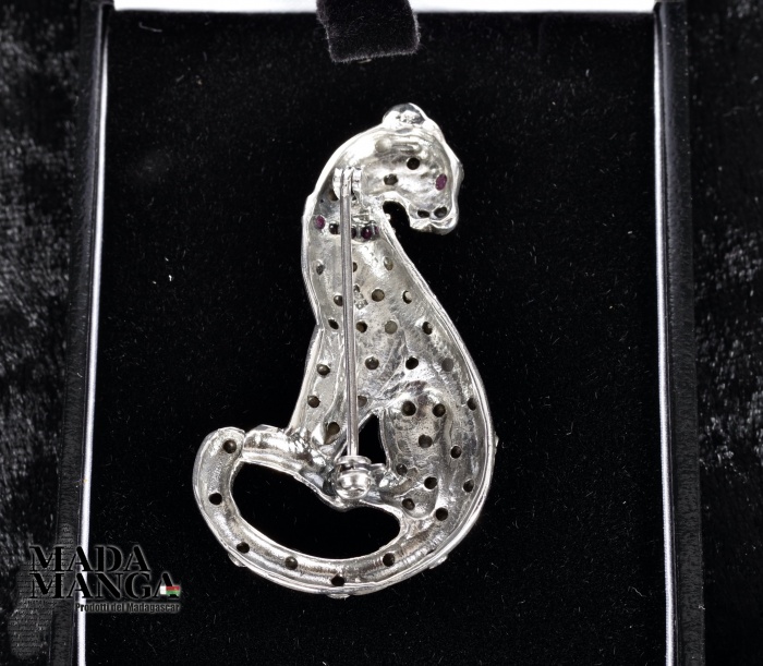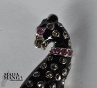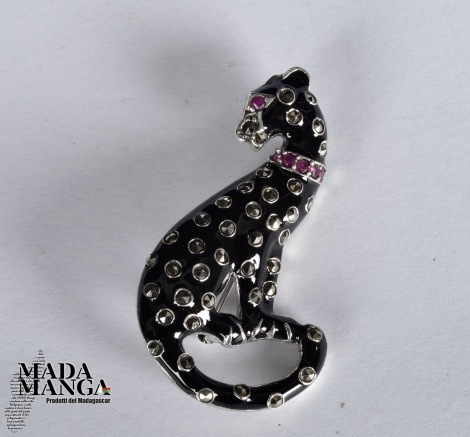 Spilla a forma di pantera in argento 925 con smalto nero, con rubini per il collare e l'occhio e marcasiti.