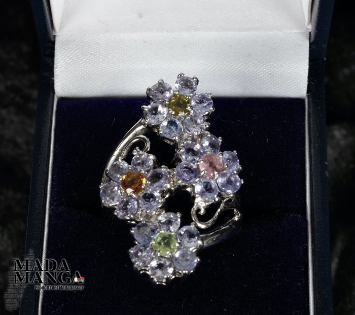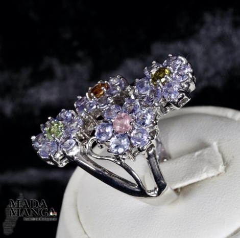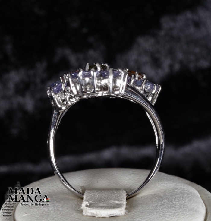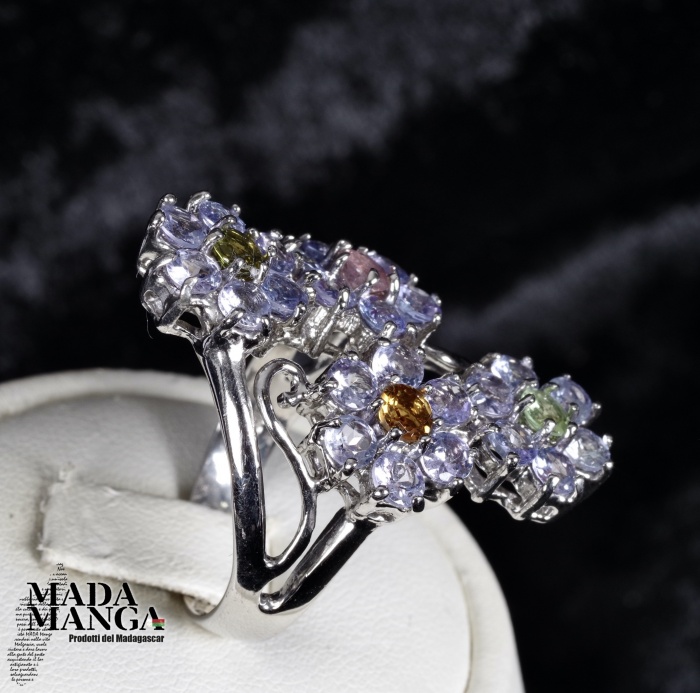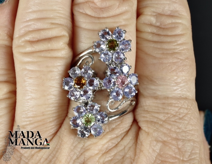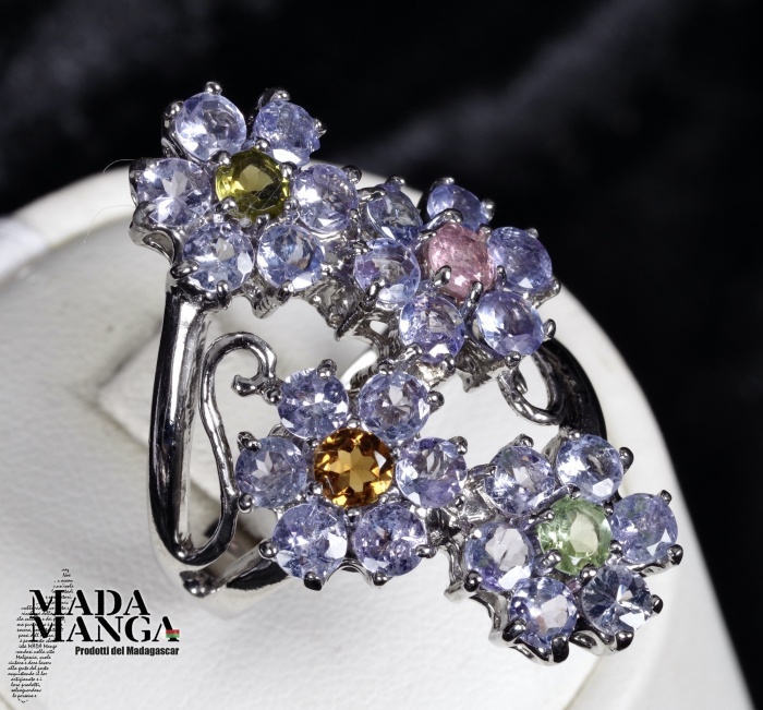 Anello in Argento 925 con placcature in oro bianco, con tanzaniti per i petali e tormaline a centro corolla dei fiori, peso 9,2 grammi. Misura americana 8,5 misura italiana 18, diametro interno mm.18,53. Venduto con scatolina regalo. L'anello è realizzato artigianalmente in pezzo unico per modello e misura.