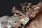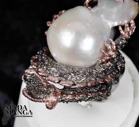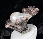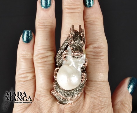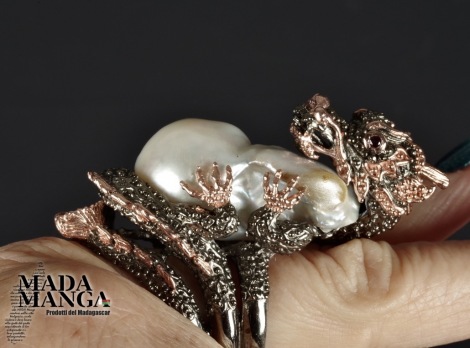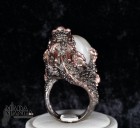Spettacolare Anello a forma di drago in Argento 925 rodiato scuro con placcature in oro rosa, con perla barocca da mm.33x23 e rodoliti per gli occhi.