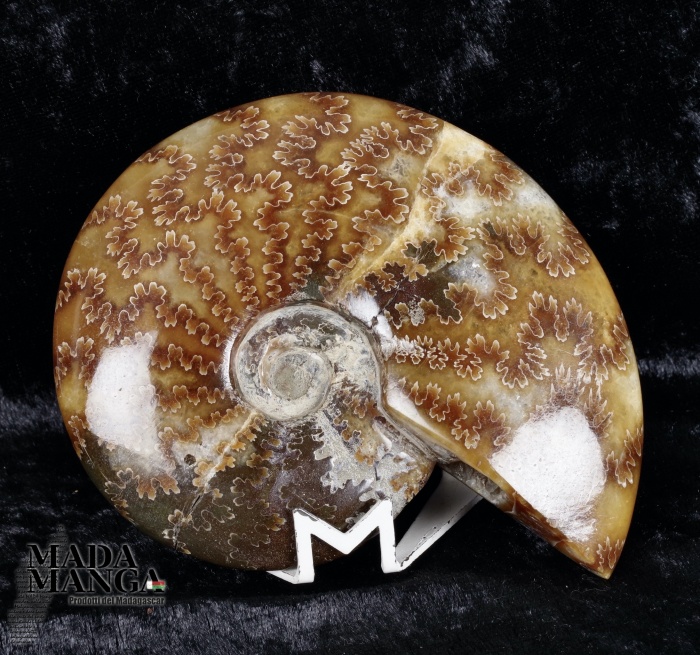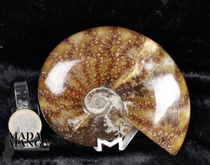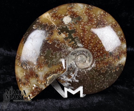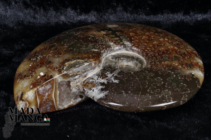 Ammonite intera lucidata, con bella definizione delle linee di sutura, dimensioni cm.11,2x9x2,7sp., peso 253,6 grammi. Provenienza Madagascar.