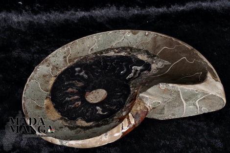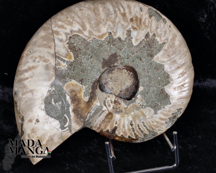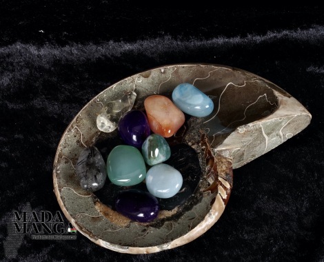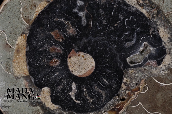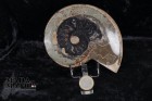 Ammonite intera scavata, intarsiata con un'ammonite più piccola al centro e lucidata, adatta anche per portaoggetti, dimensioni cm.13,7x11, peso 301 grammi. Provenienza Madagascar.