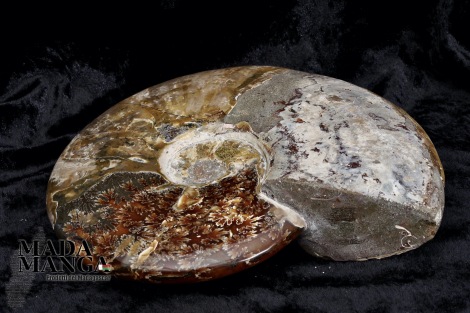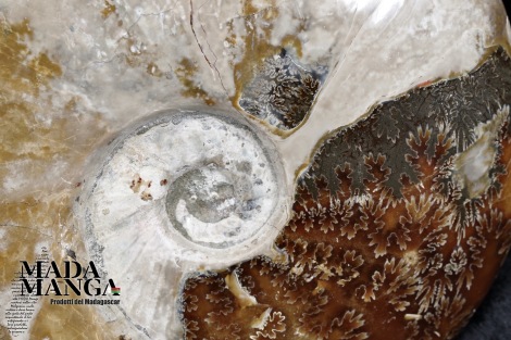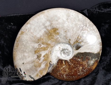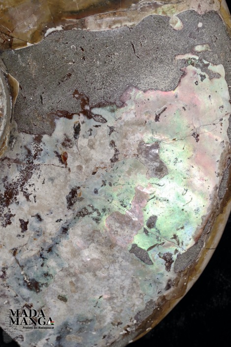 Grande Ammonite intera lucidata, con porzione di guscio iridescente, dimensioni cm.22,5x19,5x4,7 sp., peso kg.2,48. Provenienza Madagascar.