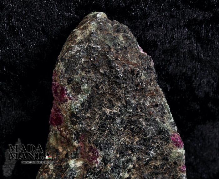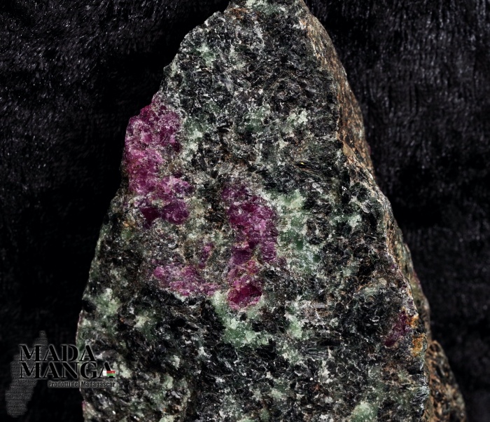 Zoisite con inclusioni di radice di rubino grezza, dimensioni cm.7,3x2,8x11,2, peso 271 grammi.