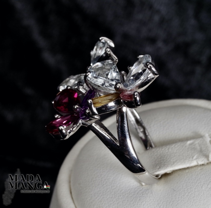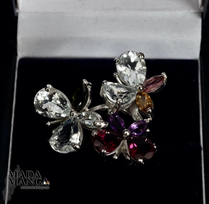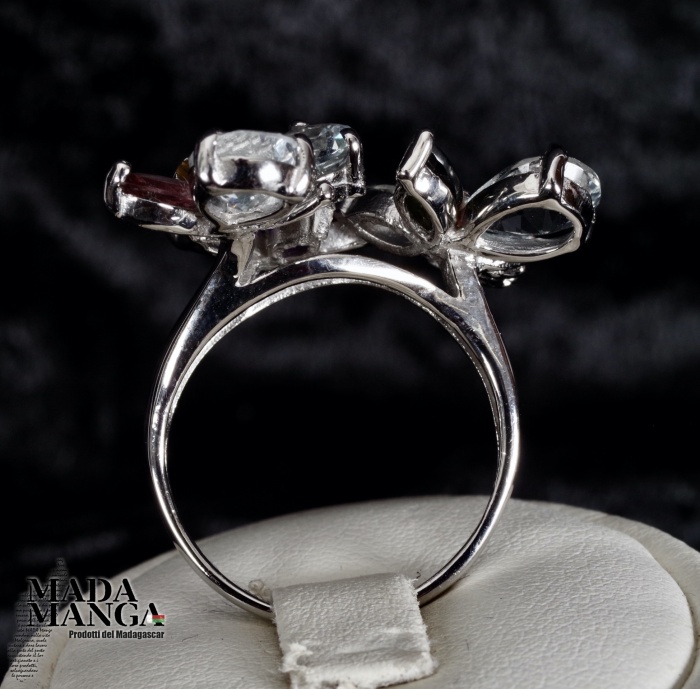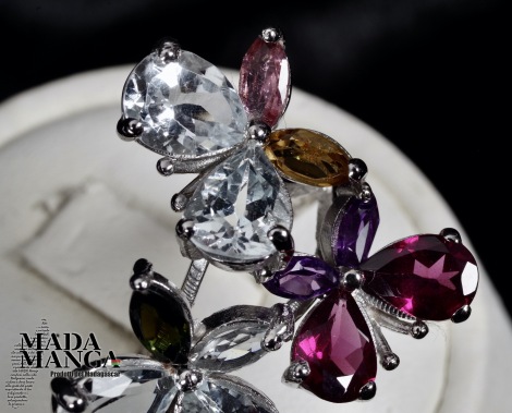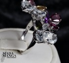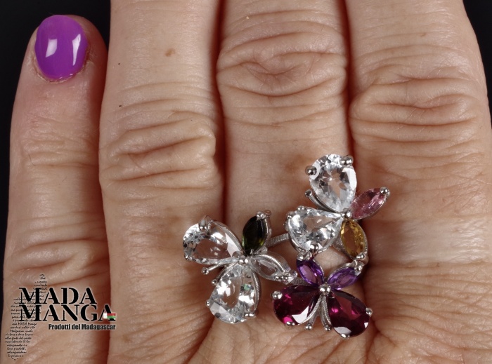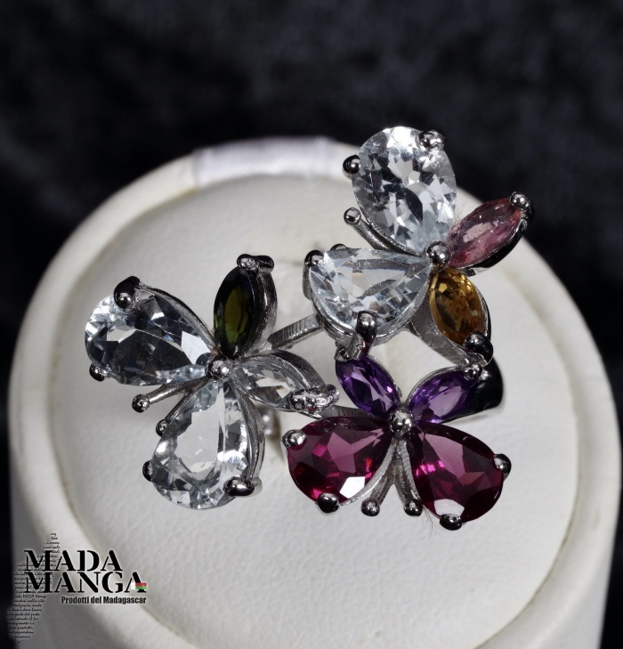 Anello in Argento 925 con placcature in oro bianco con n°4 acquamarine taglio pear per le ali delle farfalle, Rodoliti, Ametiste e Tormaline.