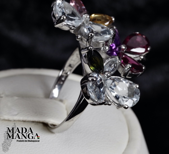Anello in Argento 925 con placcature in oro bianco con n°4 acquamarine taglio pear per le ali delle farfalle, Rodoliti, Ametiste e Tormaline, peso anello 6 grammi. Misura americana 7,5, misura italiana 16, diametro interno mm.17,75. Venduto con scatolina regalo. L'anello è realizzato artigianalmente in pezzo unico per modello e misura.