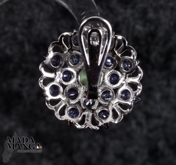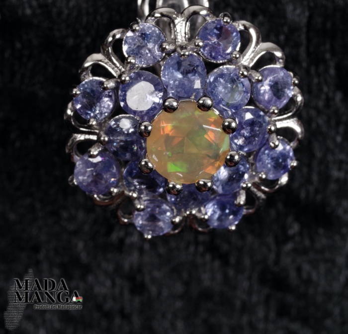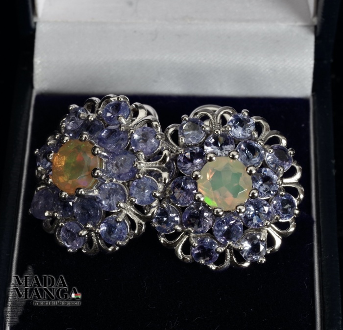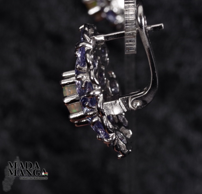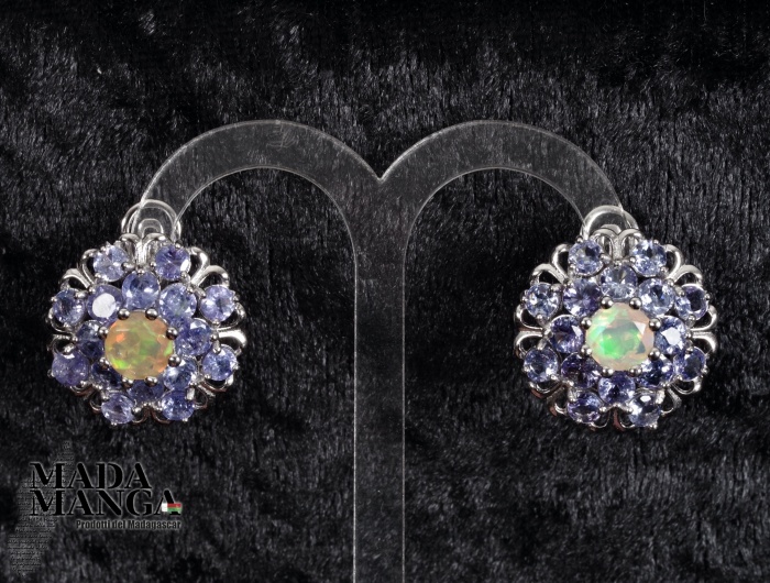 Orecchini in argento 925 con placcature in oro bianco con opali etiopi diametro mm.7 contornato da tanzaniti. Diametro orecchini cm.2,1.