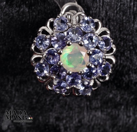 Orecchini in argento 925 con placcature in oro bianco con opali etiopi diametro mm.7 contornato da tanzaniti. Diametro orecchini cm.2,1, peso 10,6 grammi. Gli orecchini sono realizzati artigianalmente in pezzi unici. Venduti con confezione regalo.