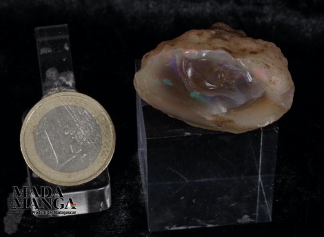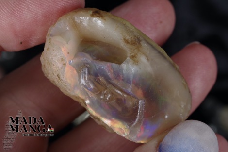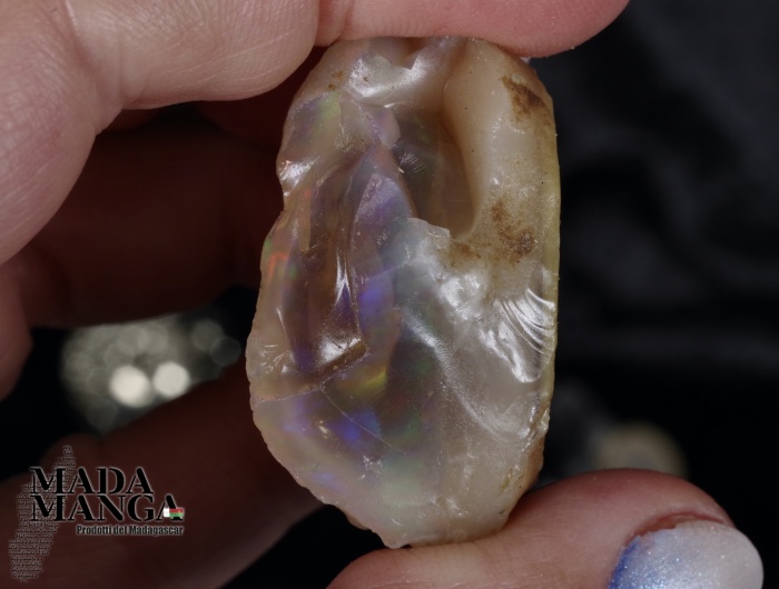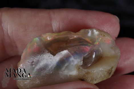 Opale etiope a "pepita" con riflessi dal rosso al verde che sotto i flash danno lampi di viola, dimensione mm.36x28x20 peso 19,8 grammi, ct.98,4