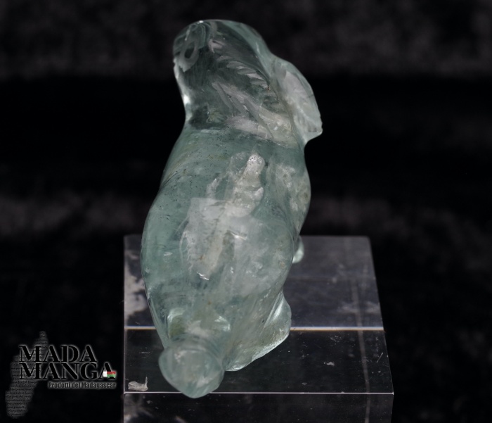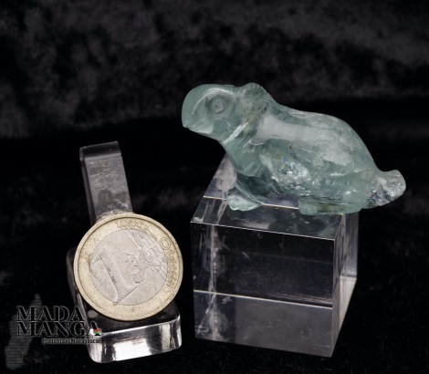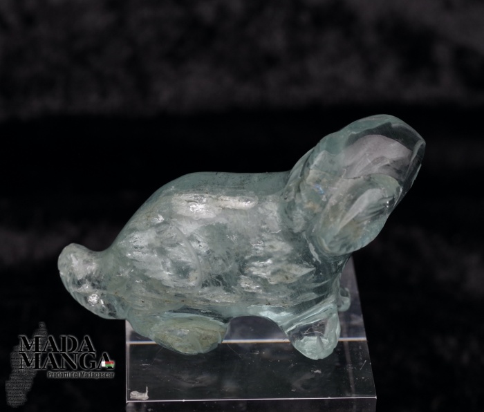Coniglio realizzato con acquamarina di bella trasparenza e colore, dimensioni cm.4,9x1,8x2,9H, peso 22,9 grammi equivalenti a 114,5 carati.