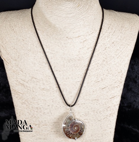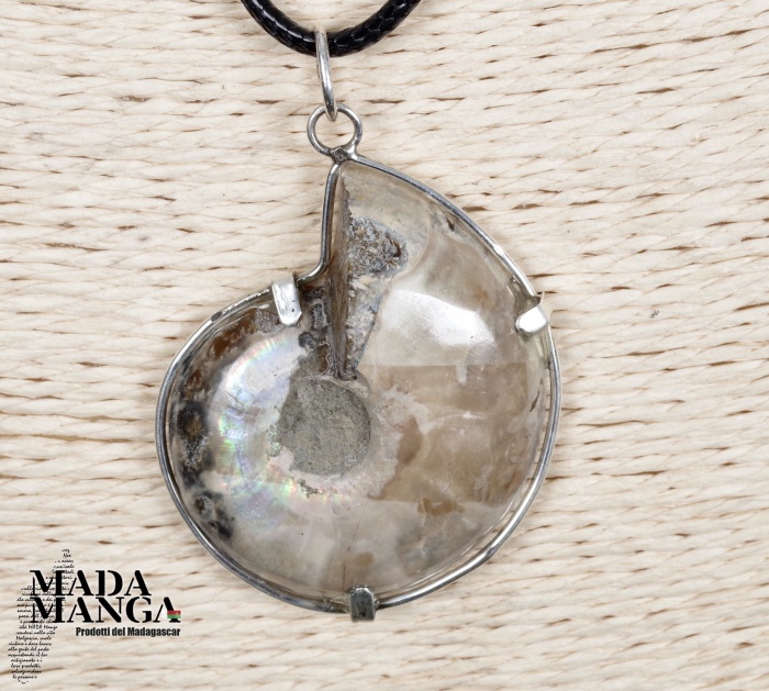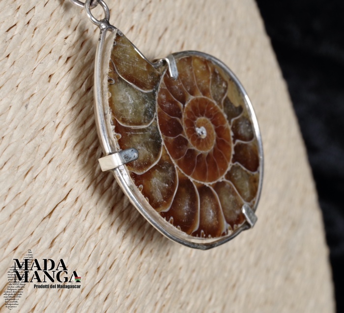 Ciondolo con Ammonite fossile naturale lucidata, perfetta definizione dei setti di crescita, montato in argento, dimensioni cm.3,2x4H, peso 13 grammi, venduto con laccetto in corda cerata.