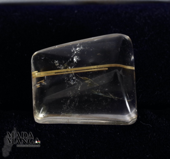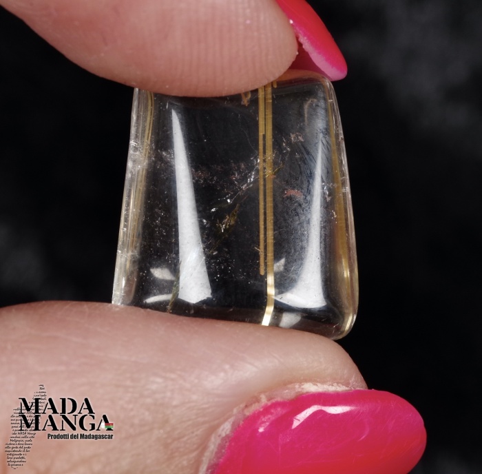Quarzo con inclusioni di rutili color oro, dimensioni cm.1,7x1,5x0,8 spessore, ct.14,6. Adatto per realizzare ciondolo od anello.